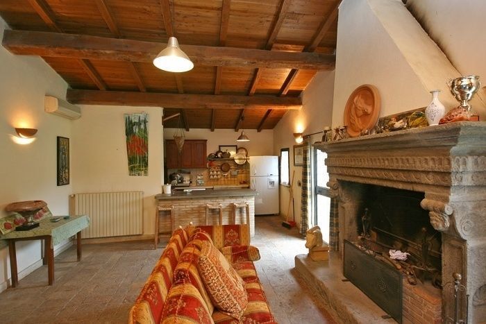 Ground floor: living-room (TV) with dining area and fireplace, kitchen, double bedroom, bathroom with bathtub.