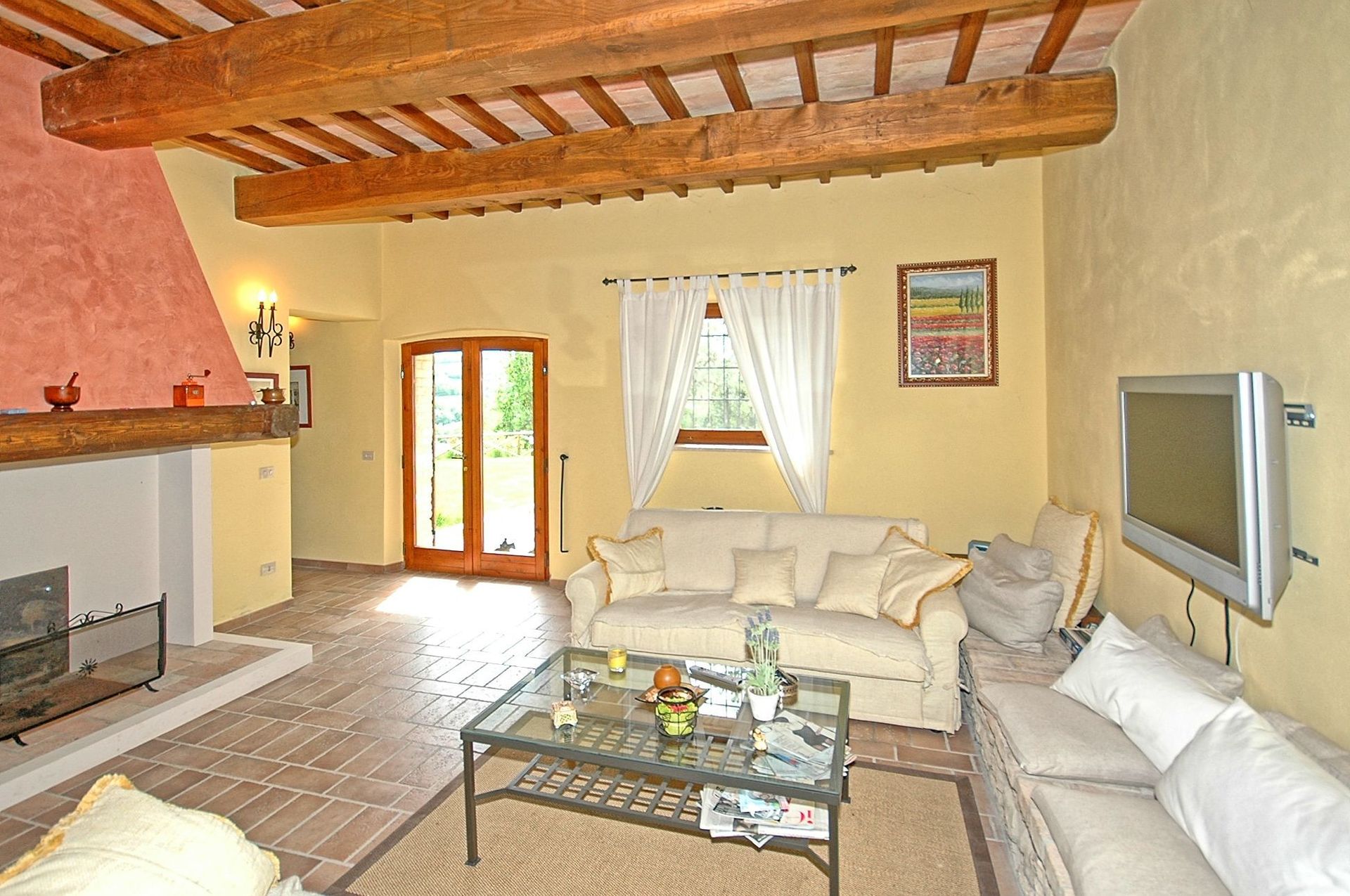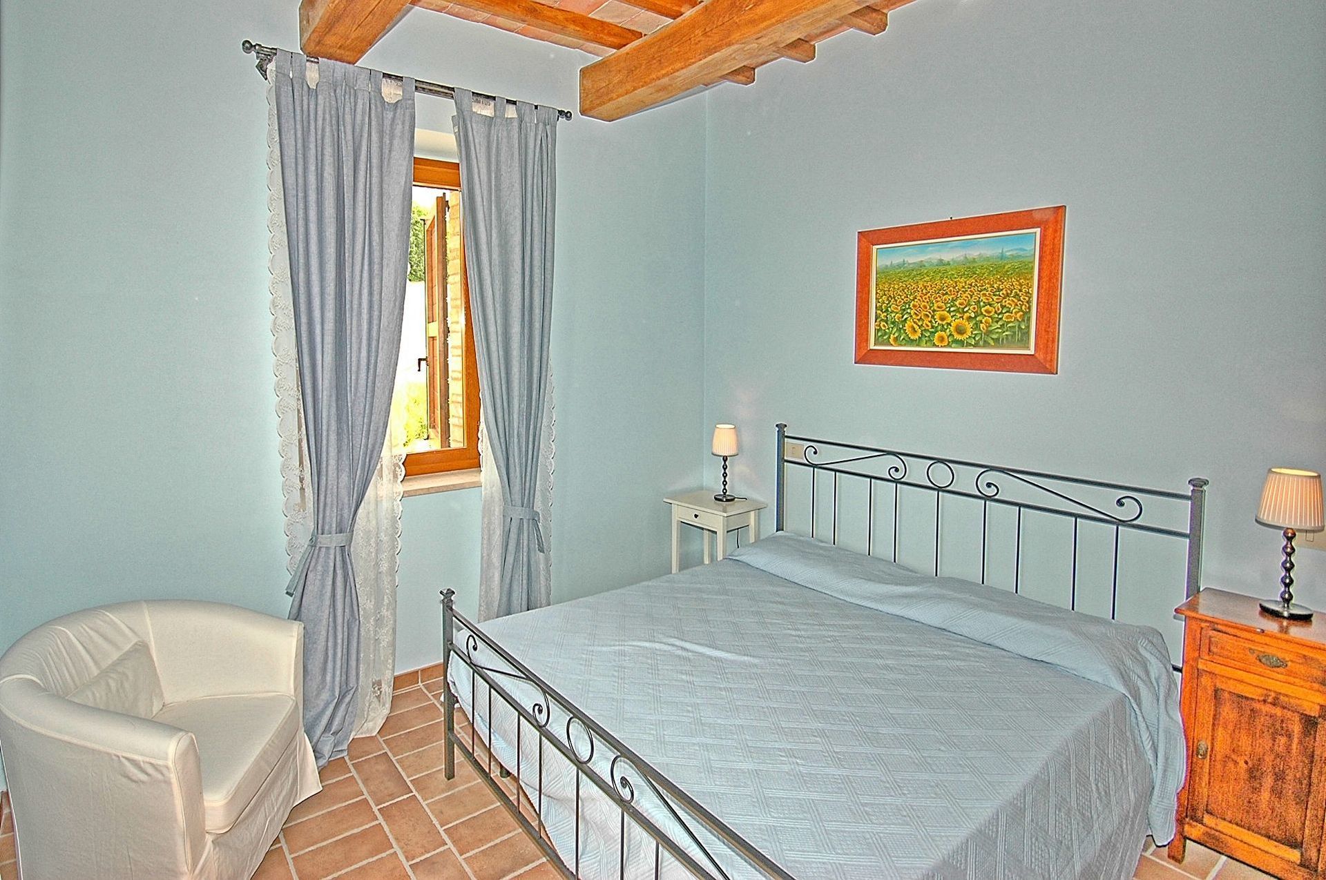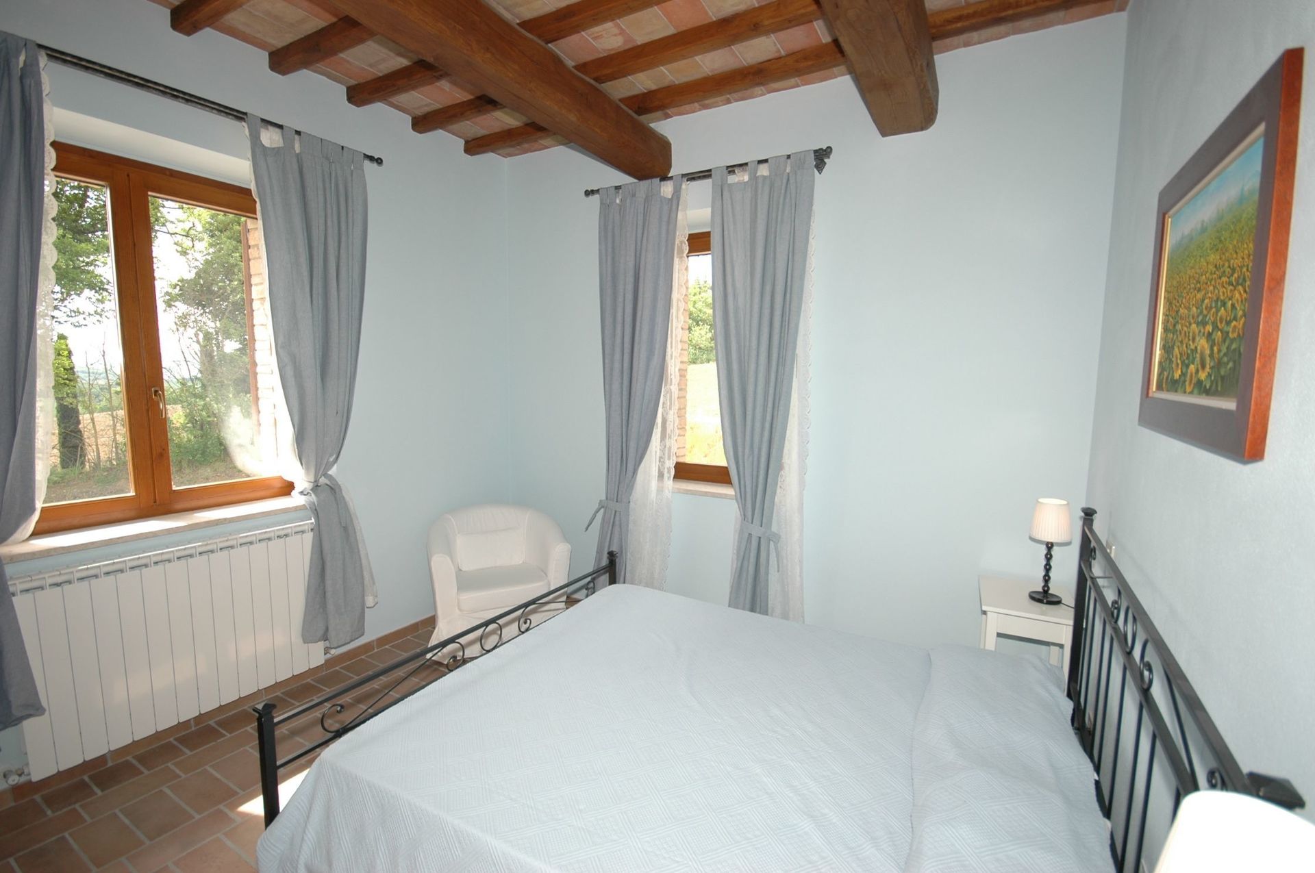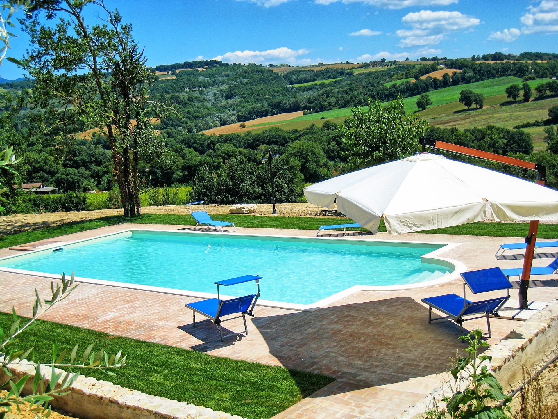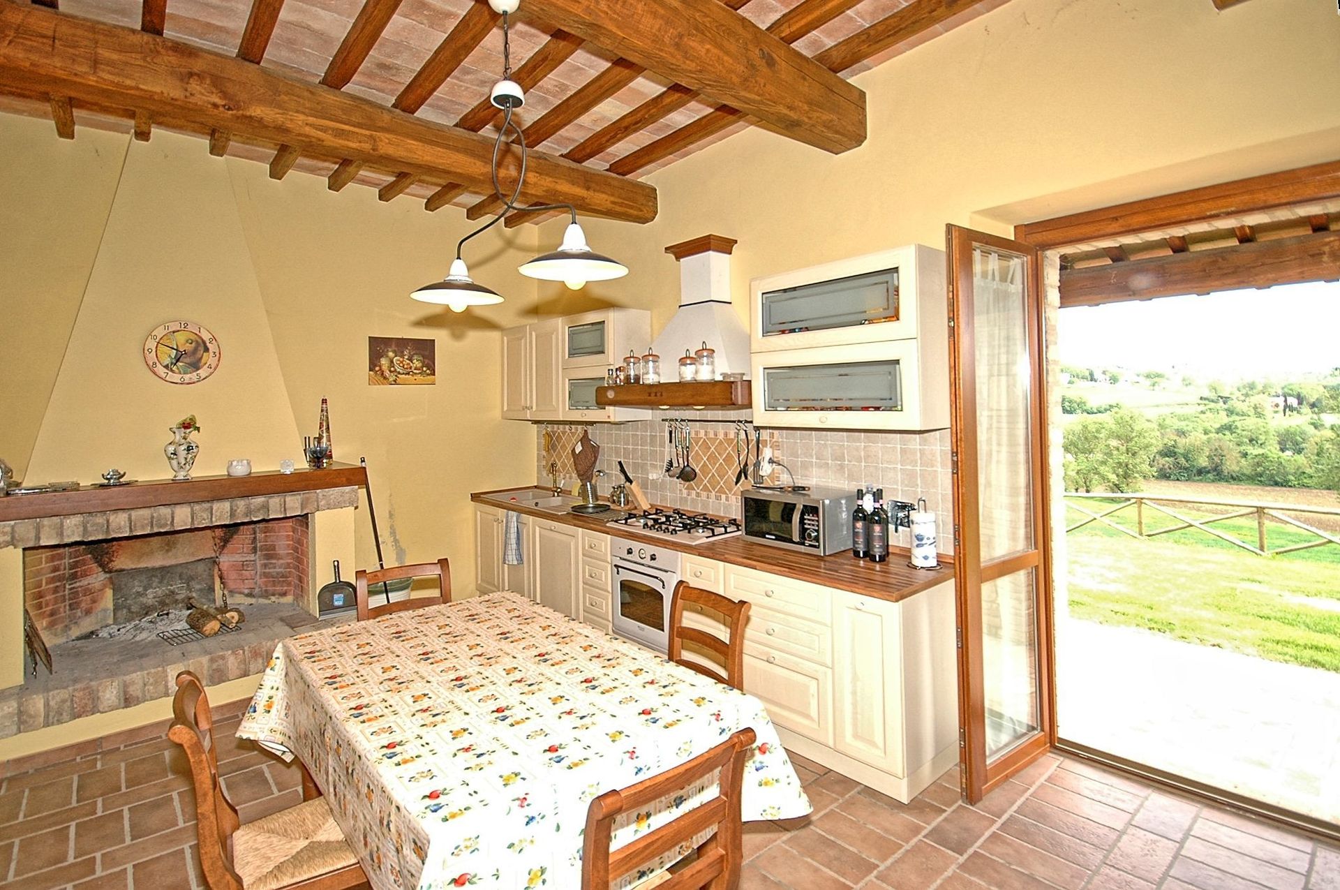 Comfortable and welcoming country house just a few kilometres from Todi, the famous city overlooking the Tevere valley, built by the Etruscans between 300 and 100 BC. The house sits in a tranquil spot among Umbria's green hills, and offers beautiful views of the surrounding countryside. Originally a farmhouse, the villa has been renovated with care, keeping its ancient charm and using authentic materials, such as terracotta floors and exposed beams. It is furnished completely and with quality, in a rustic style.