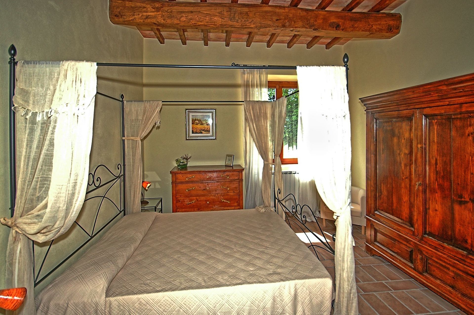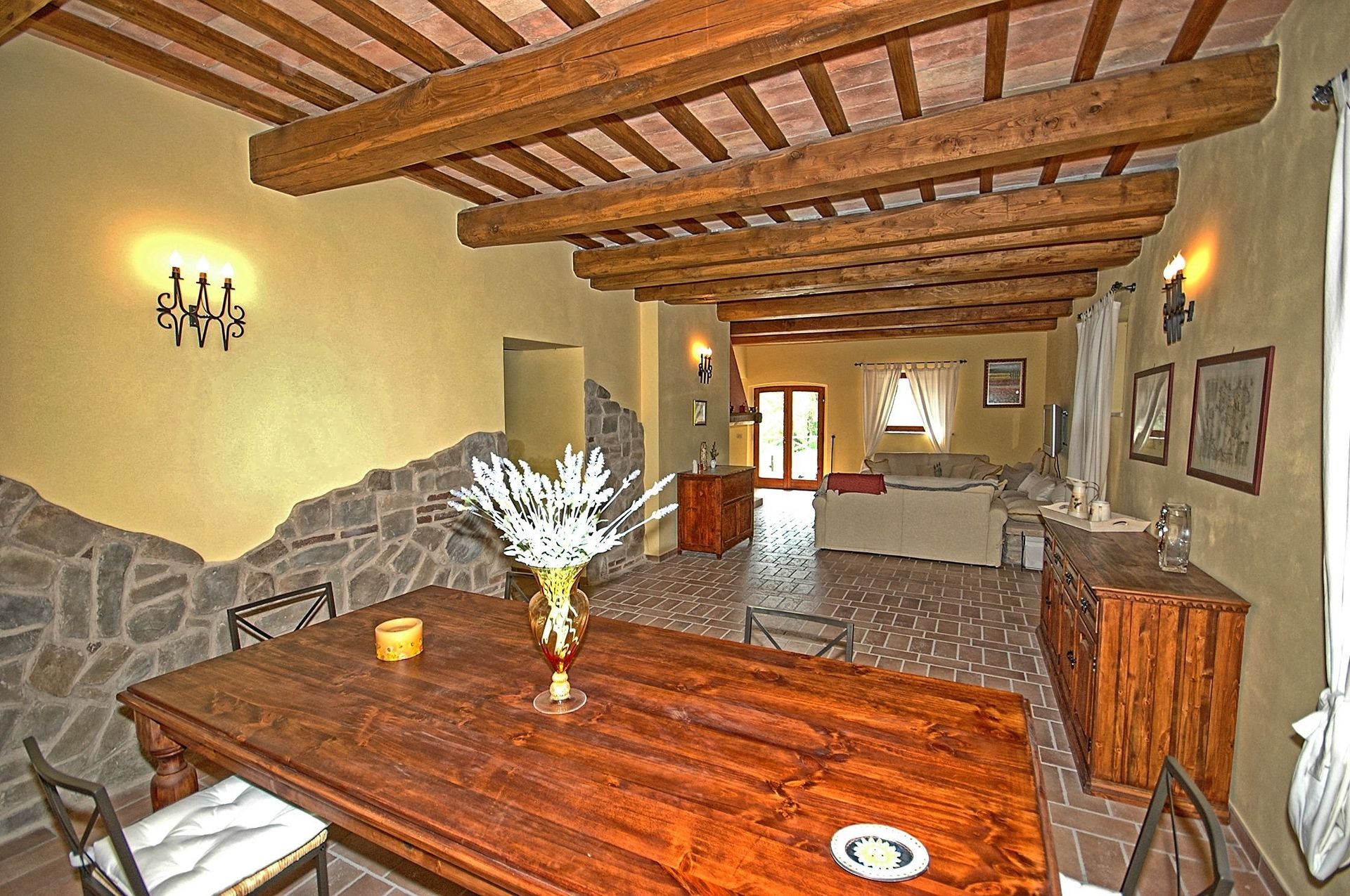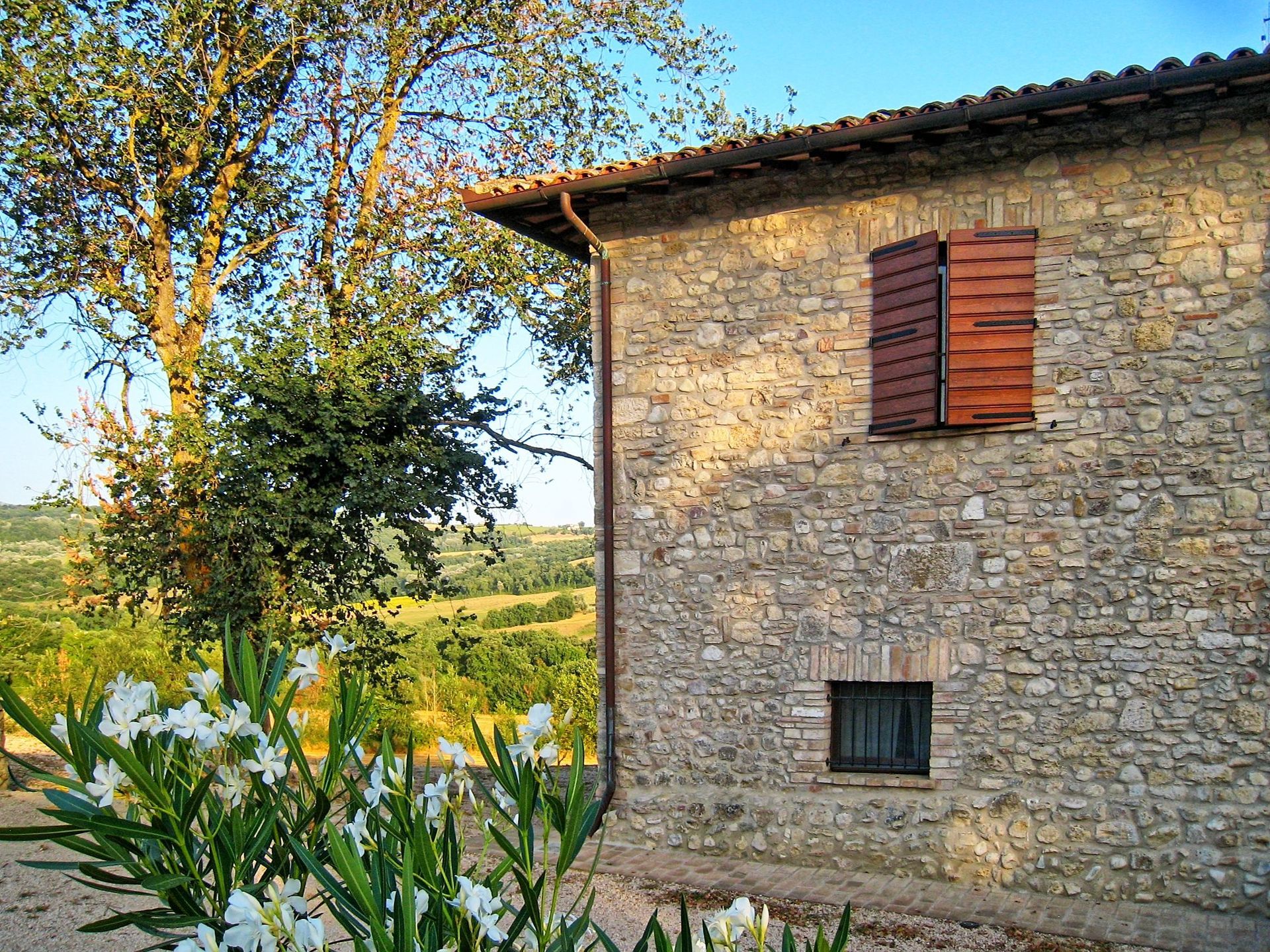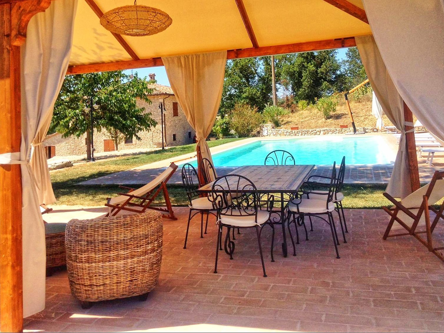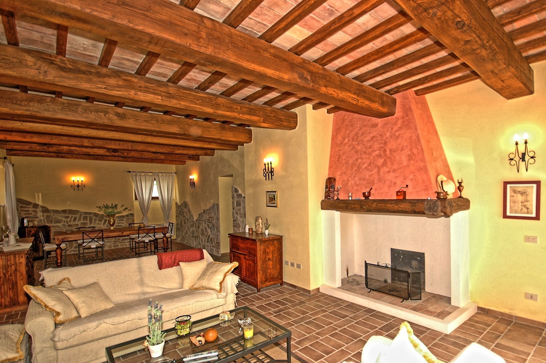 Comfortable and welcoming country house just a few kilometres from Todi, the famous city overlooking the Tevere valley, built by the Etruscans between 300 and 100 BC. The house sits in a tranquil spot among Umbria's green hills, and offers beautiful views of the surrounding countryside. Originally a farmhouse, the villa has been renovated with care, keeping its ancient charm and using authentic materials, such as terracotta floors and exposed beams. It is furnished completely and with quality, in a rustic style.