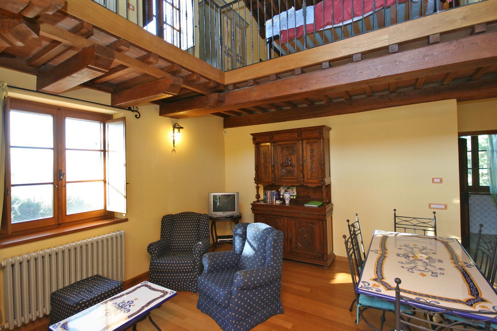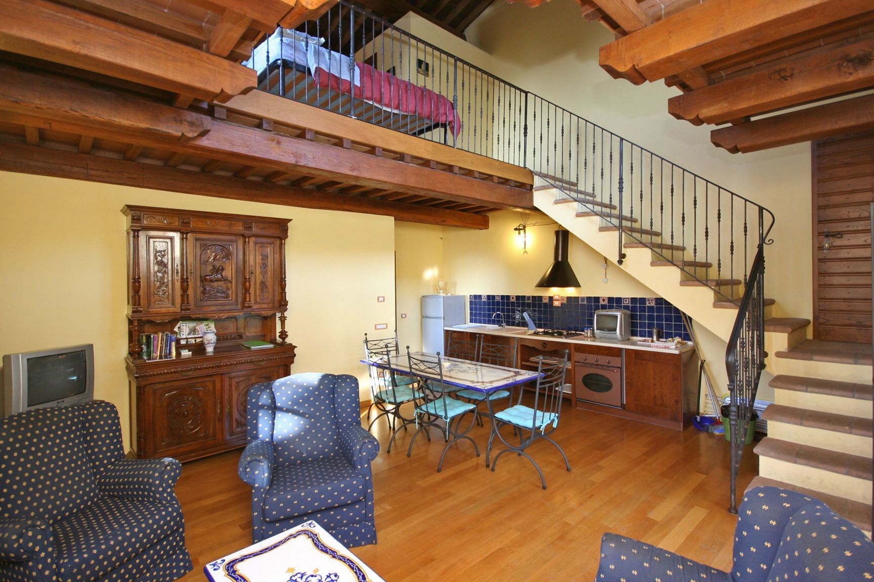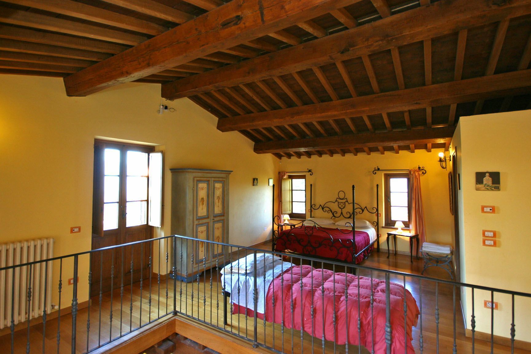 1st floor: large open gallery leaning over the living area with double bed and 2 single beds, bathroom with Jacuzzi bathtub.
