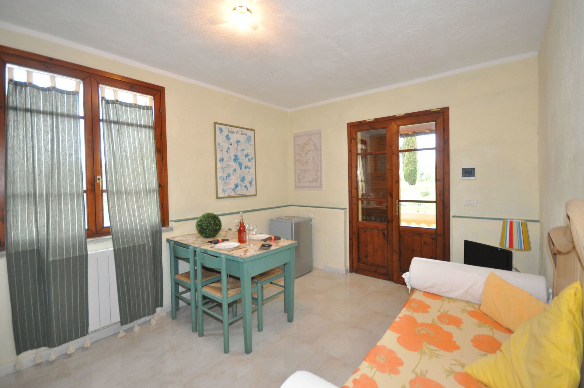 Ground floor: living-room (satellite TV) with sofa (convertible into 2 beds), dining area and kitchen corner, double bedroom, bathroom with shower.