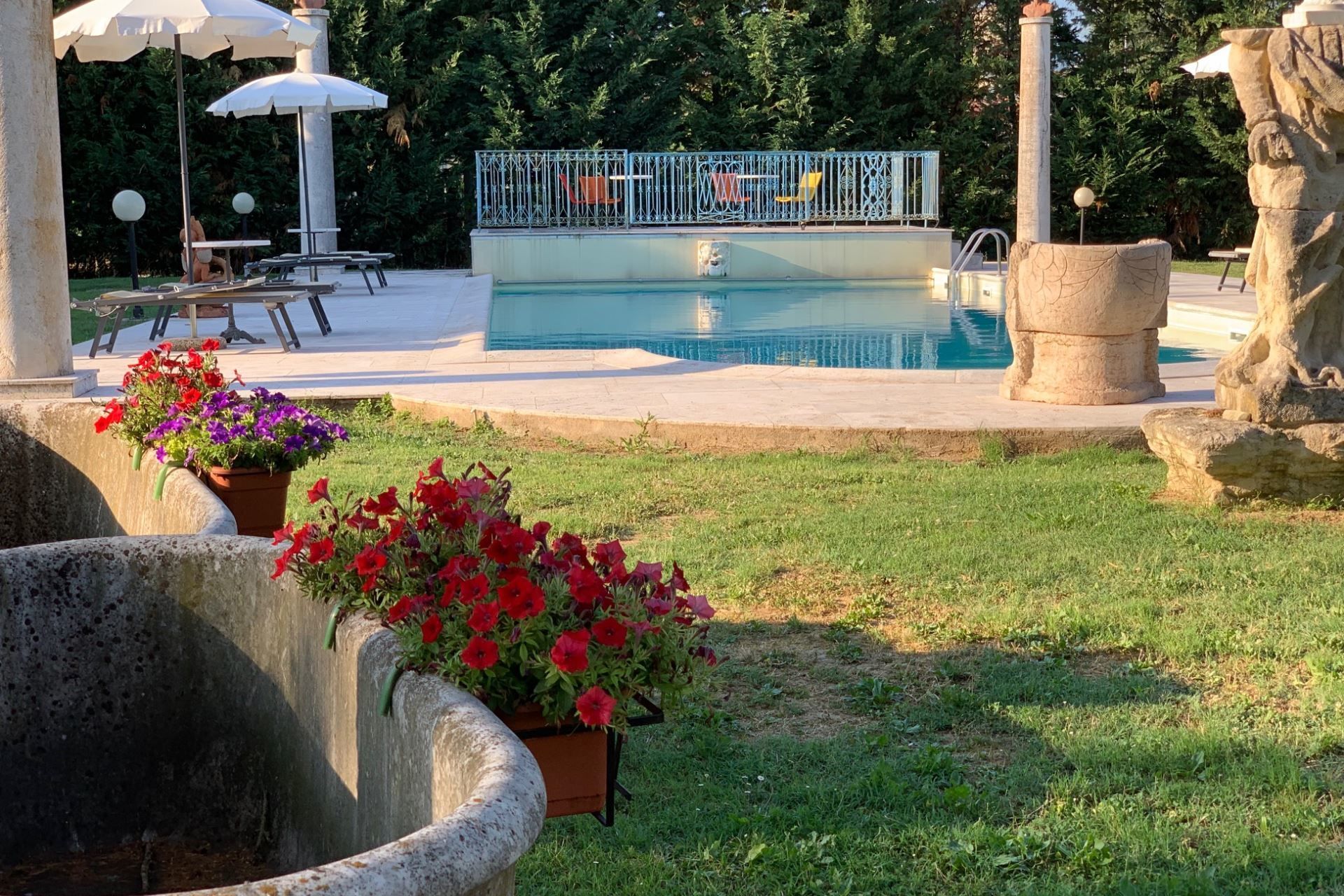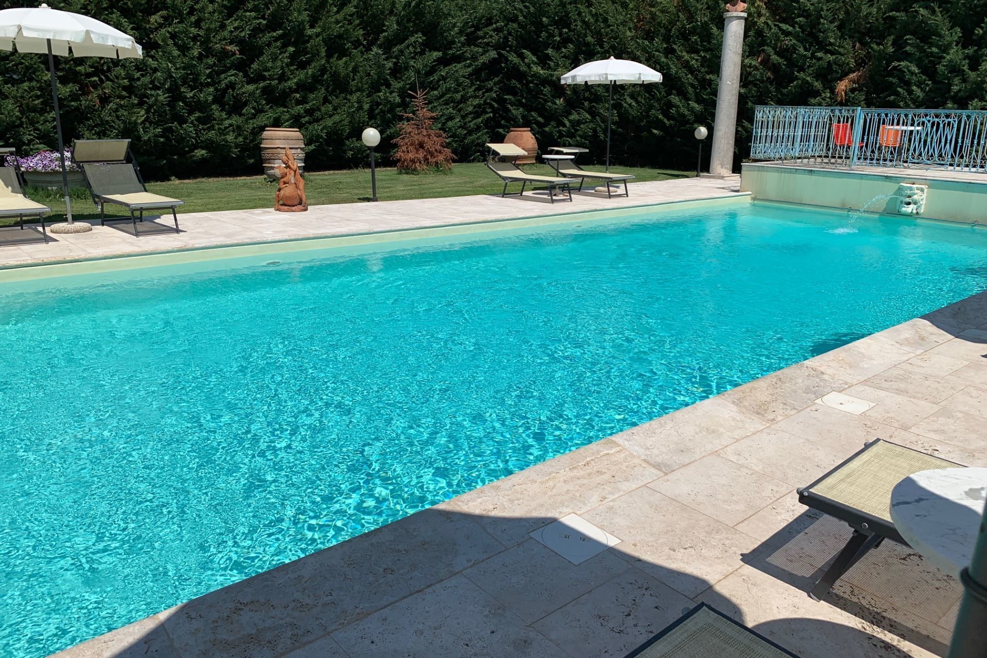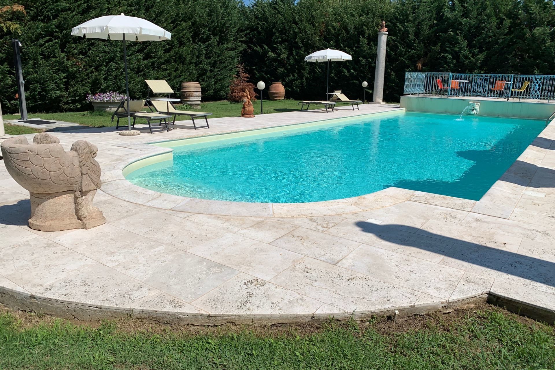 The highlights of the villa, in our opinion, are certainly the splendid swimming pool with Roman staircase (size m 16x6, depth m. 1.40-2.00 - open from 27 June to 5 September) decorated with precious marble and with changing room and bathroom with shower, the characteristic pergola covered with wisteria and roses with marble fountain and wooden benches where you can spend dreamy days in the company of your book.