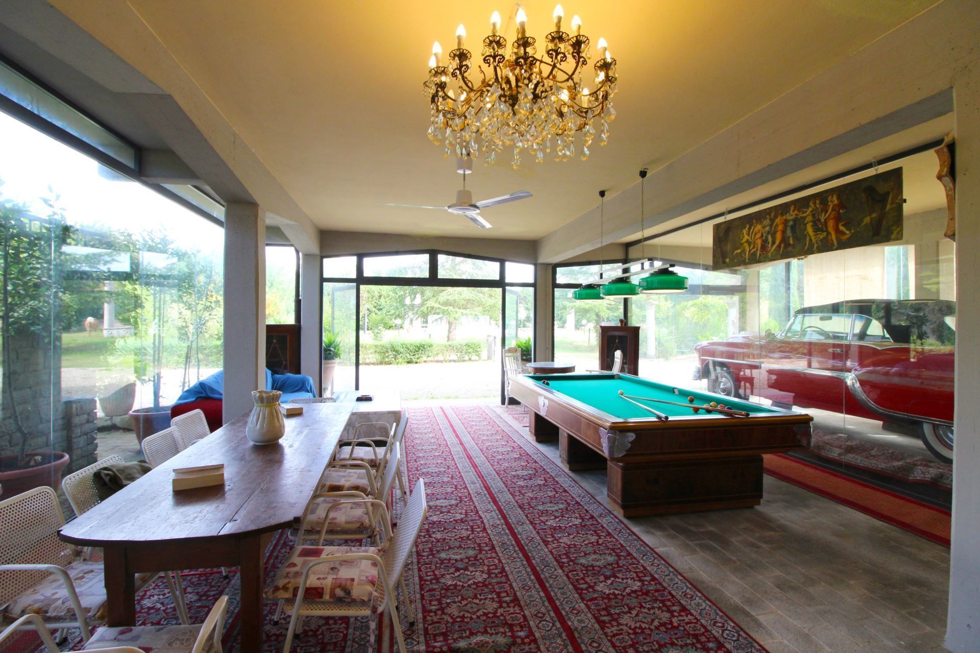 GROUND FLOOR: wide and bright glass veranda with billiards, dining table, table football, sofas and bathroom with shower.