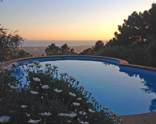 El jardín, rico en plantas florales y árboles maduros, crea un entorno naturalmente hermoso que rodea la propiedad por todos lados. La terraza está amueblada con mobiliario de jardín cómodo, lo que la convierte en un lugar ideal para cafés matutinos, comidas tranquilas o reuniones vespertinas al aire libre. Una casa de barbecue dedicada añade una dimensión acogedora a las comidas al aire libre, proporcionando un espacio protegido y bien equipado para preparar y disfrutar de las comidas en el aire fresco. La piscina, que mide 5 x 8 metros, es el centro de atención del área exterior e invita a los huéspedes a refrescarse y relajarse mientras disfrutan de las vistas panorámicas de los alrededores de la colina.