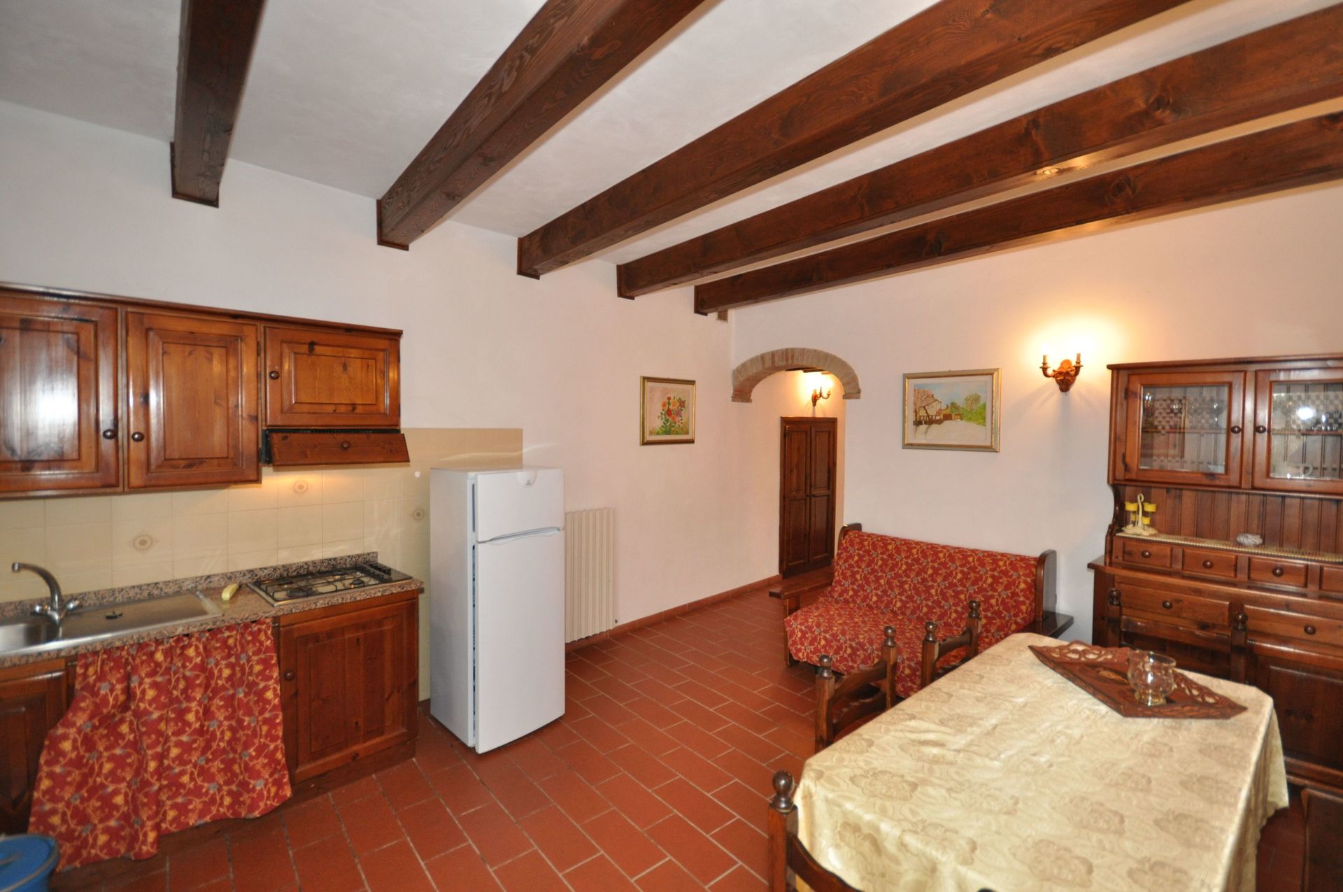 Ground floor: entrance onto dining area with kitchen corner (freezer), 2 bedrooms with 2 single beds each, bathroom with shower (without window).