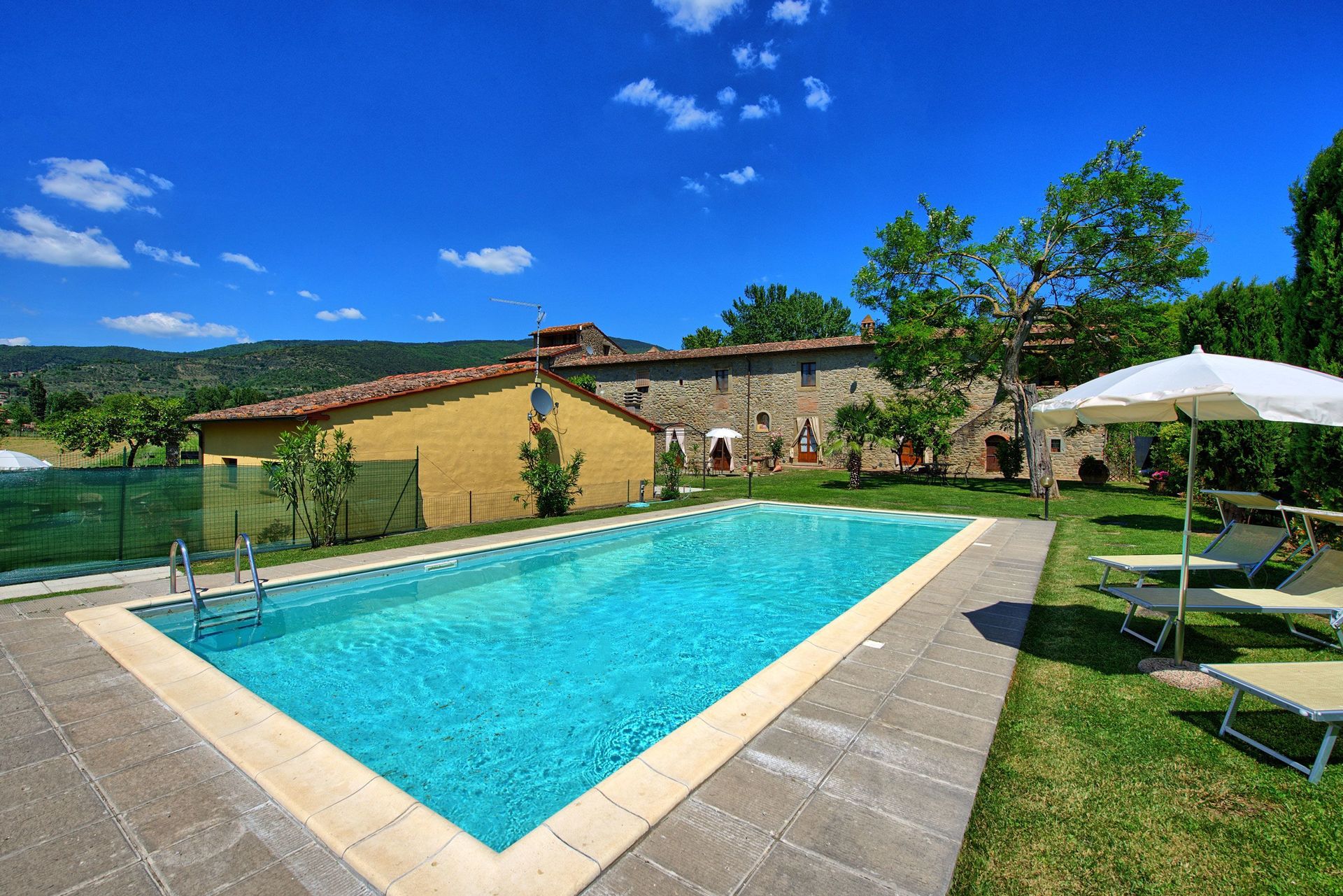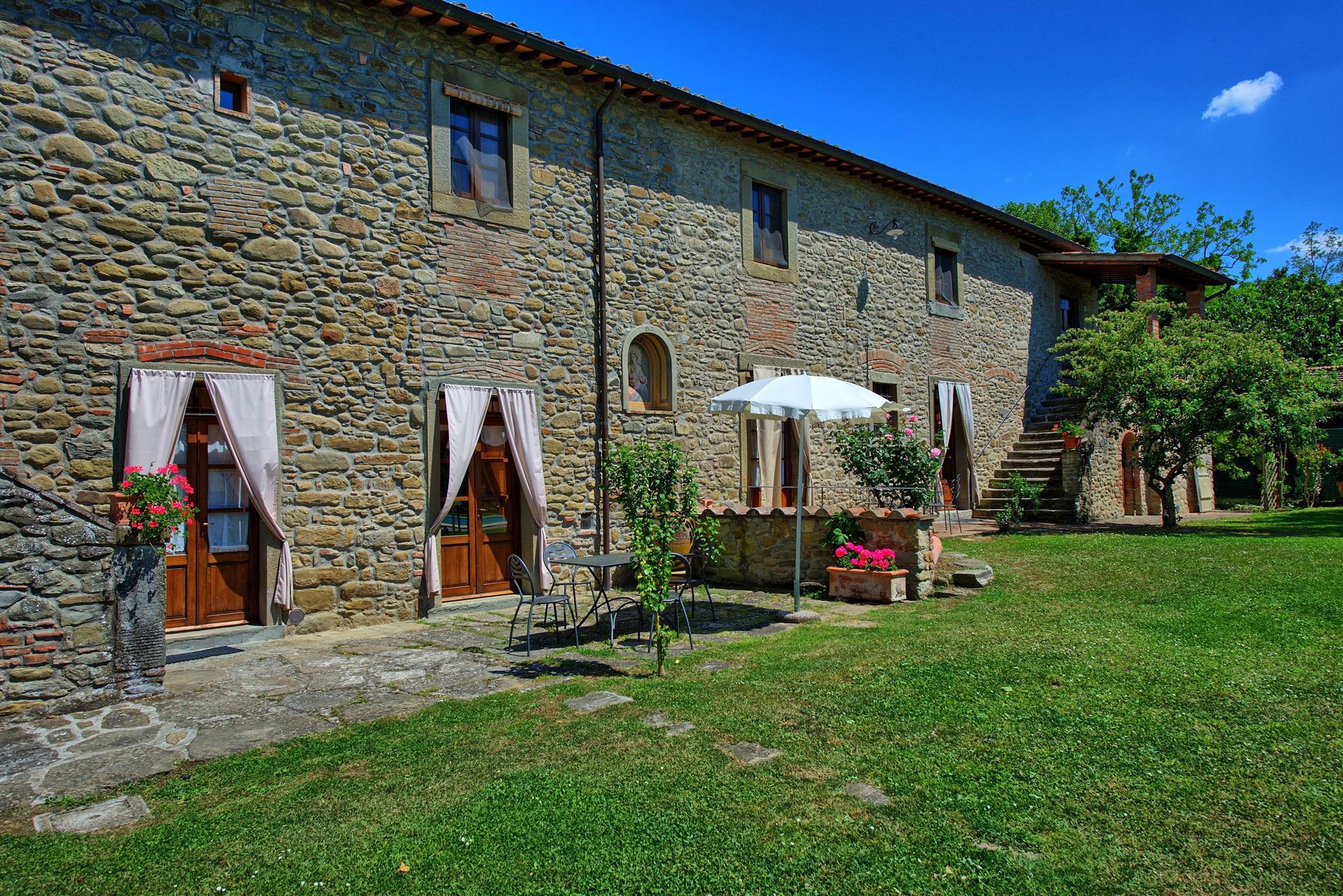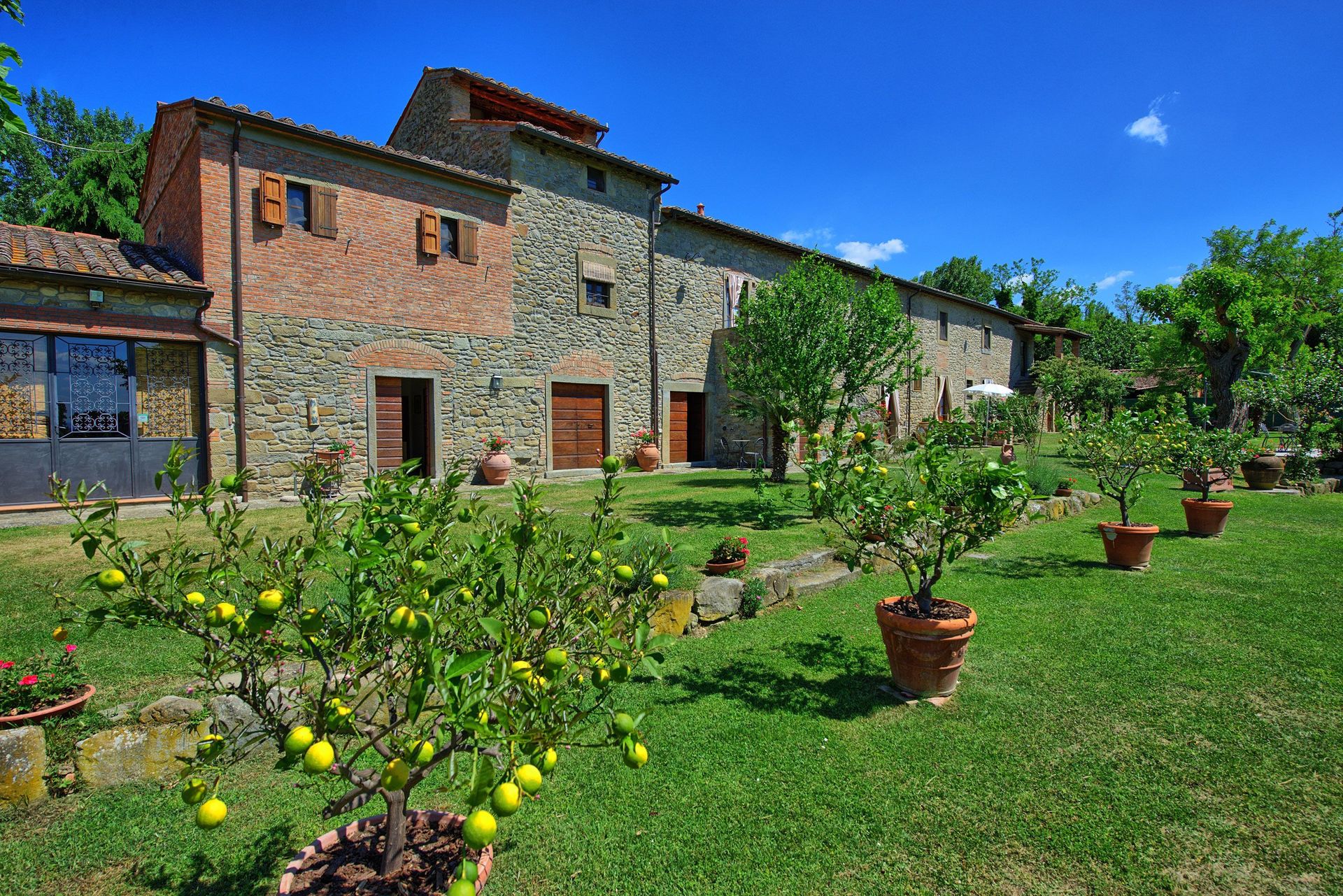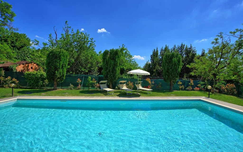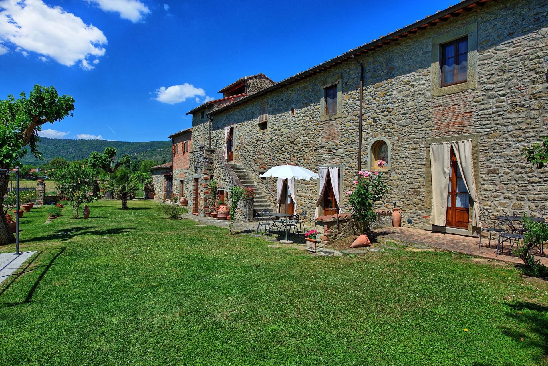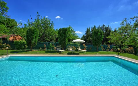 This ancient rural farm building has been finely restructured to form 4 comfortable apartments, which are available to be rented all together to a single group of friends or family. Located at the foot of the hill from which emerged beginnings of the famous city of Cortona, this property has a beautiful garden area that is well maintained and contains a swimming pool for the exclusive use of guests.