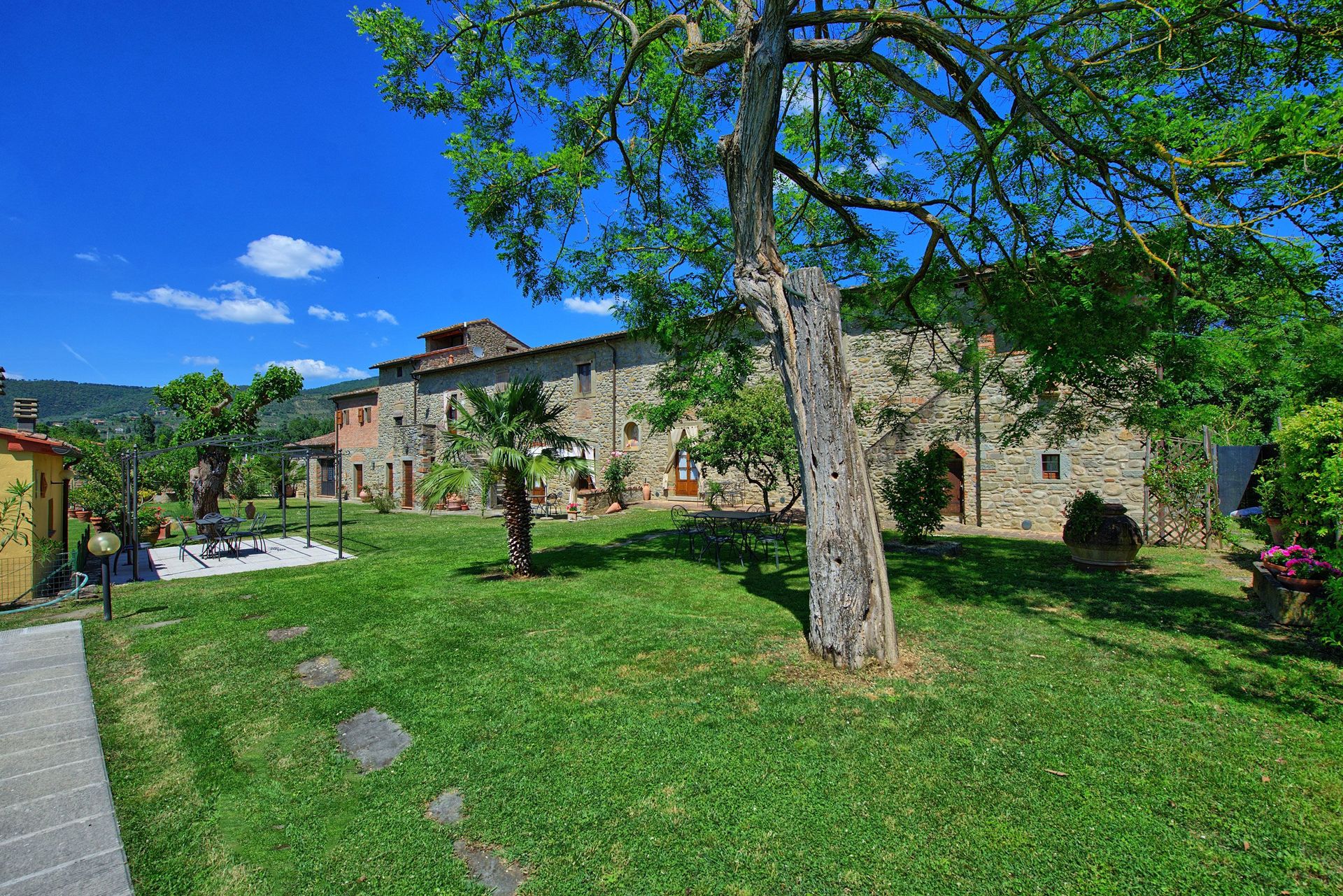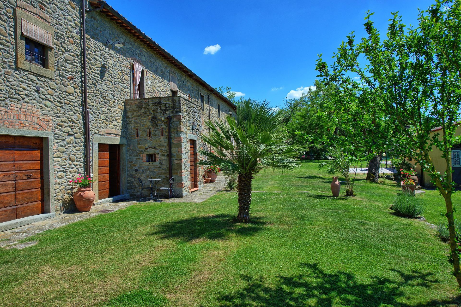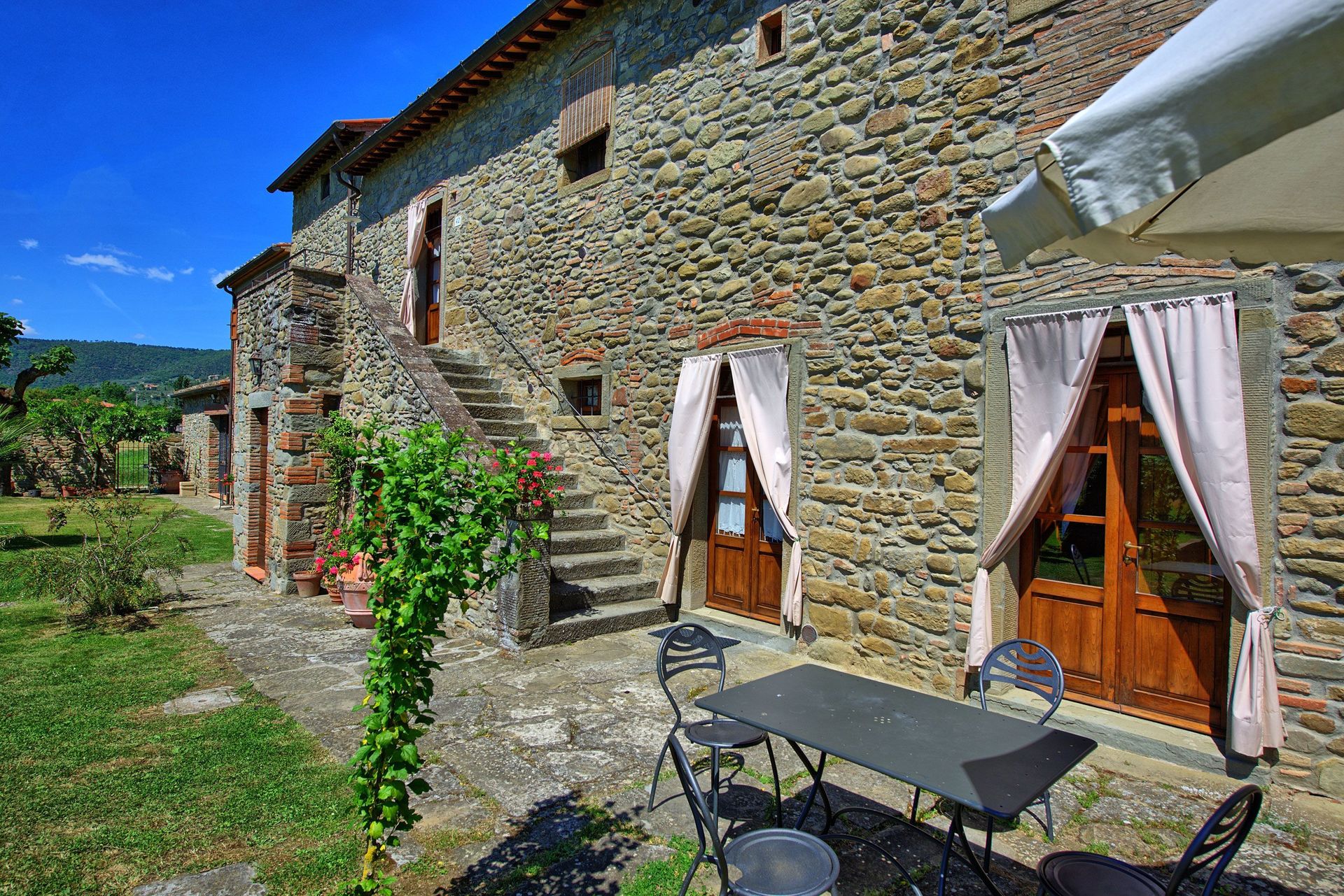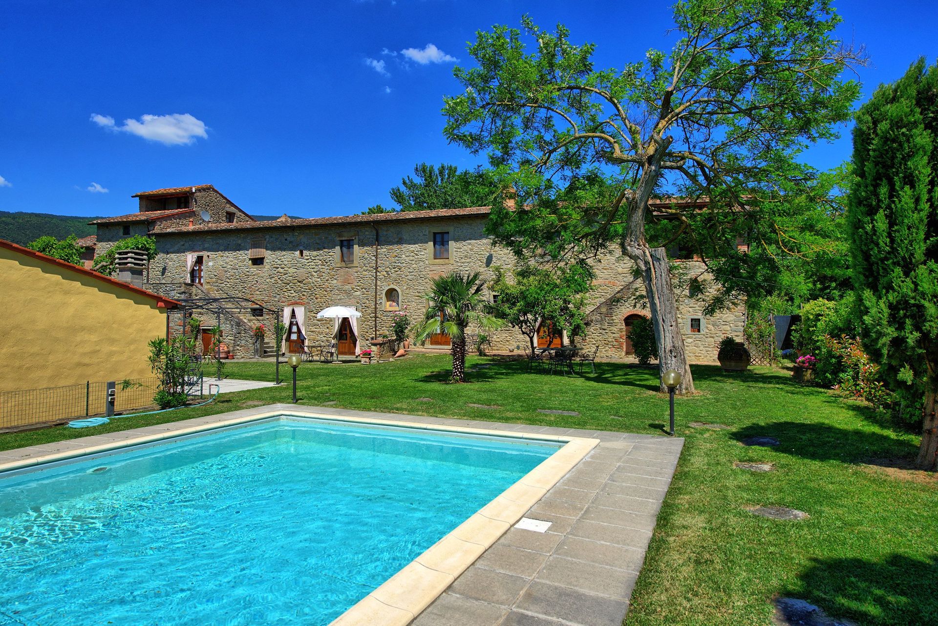 This ancient rural farm building has been finely restructured to form 4 comfortable apartments, which are available to be rented all together to a single group of friends or family. Located at the foot of the hill from which emerged beginnings of the famous city of Cortona, this property has a beautiful garden area that is well maintained and contains a swimming pool for the exclusive use of guests.