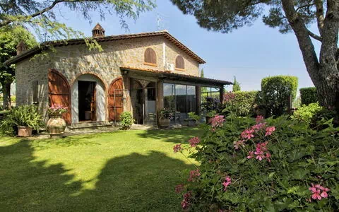 The property is located near a small country hamlet built on the ruins of an old monastery dating back to the 12th century. The house offers a large, completely enclosed outdoor area on various levels and a unique pool with transparent cover, so that the pool temperature is pleasant even in the cooler months of April, May and October. A beautiful terrace offers panoramic views of the Arno valley. It is comfortably furnished in Tuscan style. The house is composed of two apartments that are only rented together to the same group of people.