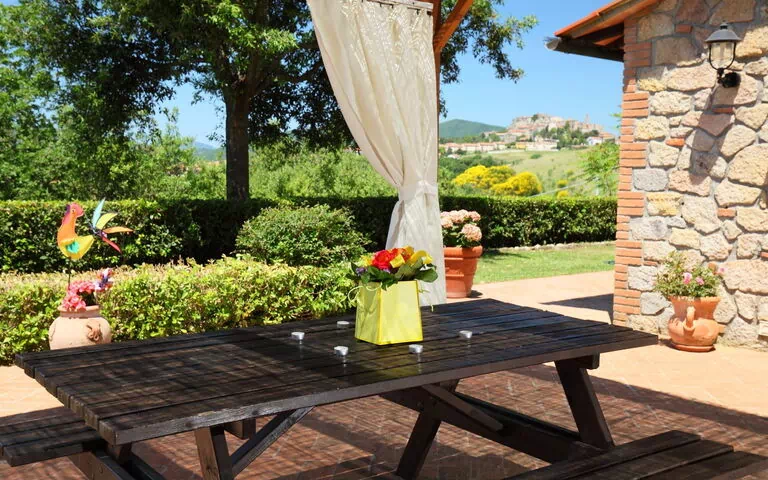 Los espacios exteriores están diseñados para fomentar la relajación y el disfrute del paisaje natural circundante. El terreno vallado cuenta con un césped exuberante con plantas florales que crean un entorno colorido e invitador durante los meses más cálidos. Un patio privado proporciona un lugar ideal para comer al aire libre o simplemente descansar en el aire fresco toscano, mientras que una ducha exterior añade un toque práctico y refrescante a las comodidades exteriores. La posición tranquila y aislada de la propiedad garantiza que el tiempo pasado al aire libre sea tanto restaurador como privado.
