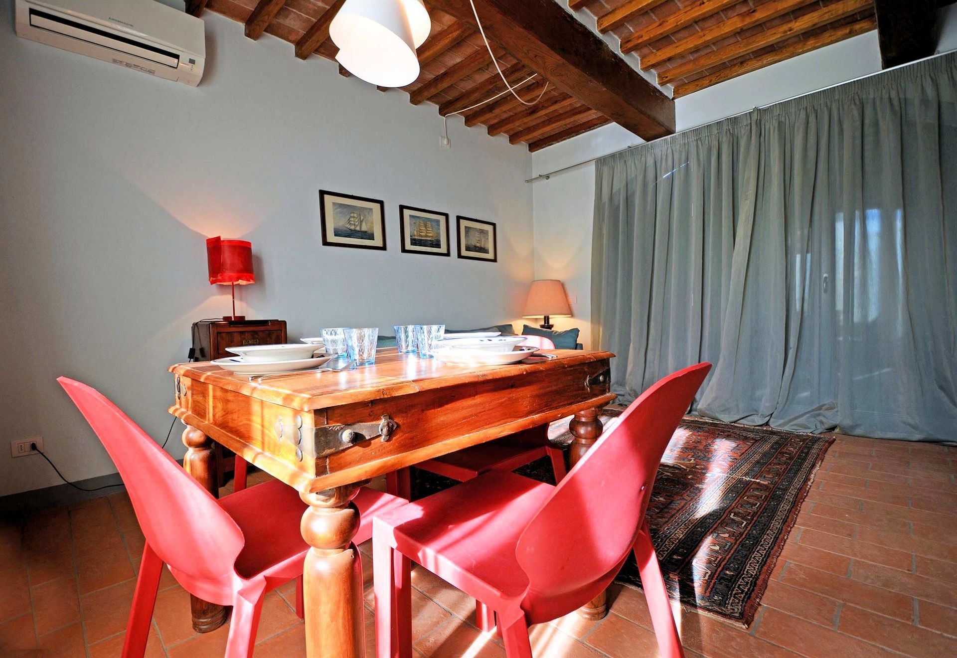 This apartment has a private, covered veranda equipped with a table and chairs. It has a small entrance which leads into a sitting room with a kitchenette, one double bedroom and a fully furnished bathroom including a hairdryer. The house has all the modern comforts including heating, air conditioning and a TV.